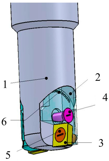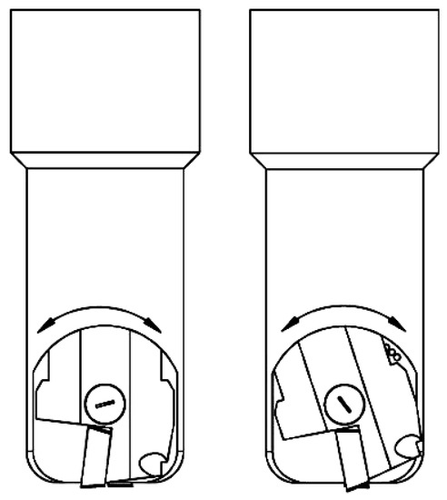 This research adopts the adjustable holder as shown in Figure 1, which can be applied to study high-speed cutting on the fixed holder and blade. The rake angle of the tool is mainly adjusted, and different rake angles of the tools have obviously different cutting characteristics. The key components of the adjustable cutting tools include the holder body, the rotation mechanism components, the positioning components, the anchor screws to the rotation mechanism components, the disposable blade, the anchor screws to the blade, and other important components. The rotation mechanism components are mainly adjusted and are fixed at different processing feed-rate speeds with different materials, as shown in Figure 2. The tool rake angle α and tool clearance angle η will have different changes when adjusting the rotation mechanism components. The right side shows the side view, and the left side shows the front view—as shown in Figure 3. In this research, the analysis and studies will be carried out from different perspectives.