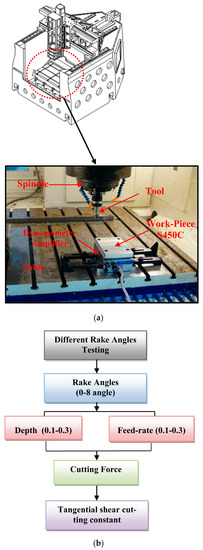 Two different materials of medium carbon steel S45C are used in this cutting experiment. The cutting signal is read by a dynamometer and data capture box, and the cutting force data are then analyzed by software. Relevant comparisons are then made after these calculations. The cutting experiment and the measurement method are shown in Figure 6. Moreover, the chips of milling and the blades are sorted, and a picture is taken to observe the tool abrasion and chip change so as to explain the status and phenomenon of the experiment. The tested work-piece applies the surface rough-meter to measure the surface profile of each finished surface. The feed per tooth (ft) has three feed per tooth of 0.1, 0.2, and 0.3 (mm/tooth). The cutting depth (ap) has three equal parameters of 0.1, 0.2, and 0.3 mm. The specifications of the tools are shown in Table 1. Tool material of H type is then coated in material TiALN. Cutting condition in the spindle speed by corporation to the recommended value, when the used S45C material by the spindle rotation speed for N = 2500 rpm, the experiment flow chart as shown in Figure 6b.