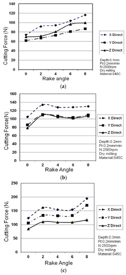 Different tool rake angles in cutting characteristics can obviously affect the cutting force. When the cutting rake angle and cutting depth is too big, the cutting force also increases relatively, as shown in Figure 7a–c. The main reason for this is that when the rake angle is big, the contact area of the flank is increased, which causes an increase of the cutting force. In this experiment, the direction of the X axis is the feed-rate cutting direction, thereby the cutting force in the direction of the X axis is big. With different cutting depths, the bigger the cutting depth is, the smaller the stress the Z axis is, which is mainly affected by the size effect. Therefore, the tangential shear effect and the tangential plough effect will be discussed.