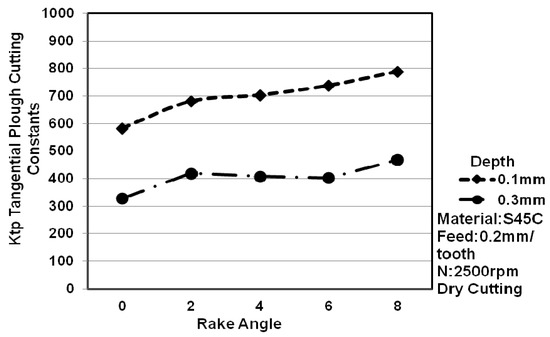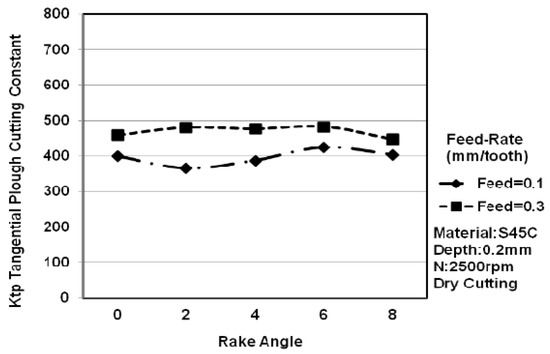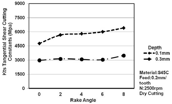 When the cutting depth is a definite value, we observed a relationship between the tangential shear constant and the cutting rake angle, as shown in Figure 11. The feed-rate per tooth of Ft = 0.3 mm/tooth is bigger than Ft = 0.1 mm/tooth in the tangential shear constant. Therefore, the impact of the feed-rate per tooth and the tool rake angle on the tangential shear constant is non-significant.