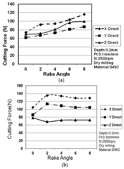 By changing different rake angles of tools, Lin [1] verified that when the rake angle of tools is increased, the maximum equivalent stress, the unit cutting force, and the cuttings temperature will decrease. Huang [2] once discussed the milling force and the post-processing surface roughness of the medium carbon steel and the fast cutting steel during turning and milling, and the experiment results showed that, under the same conditions, the smaller the cutting force endured by the tool during the cutting, the better the machinability was for the workpiece material. Moreover, a larger helical angle of the cutting tools means a bigger cutting rake angle, and thus the surface abrasion between the cuttings and the tool will be reduced and the shearing strain will also be reduced. However, the effective shear angle will be increased, which reduces the cutting force gradually [3,4] so as to improve the processing efficiency. Many domestic scholars have carried out research in the field of measuring cutting force.