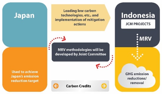 Joint Crediting Mechanism (JCM) is a bilateral cooperation between Japan and the host country in low carbon development implementation that intended to push Japanese private-sector companies to invest in Low Carbon Development activities in Indonesia, as a host country, by giving financial and technical incentives. JCM activities cover many sectoral scopes, including energy efficiency, renewable energy, deforestation and forest degradation, waste management, fugitive emission, and the manufacturing industry. Indonesia hopes that JCM can be an interesting alternative to support Greenhouse Gas (GHG) emissions reduction activities that are conducted by both Indonesia private and public sectors and support economic growth without overriding environmental sustainability. Until mid-2017, 109 feasibility studies have been undertaken under the cooperation between Japanese Company partnership with Indonesian private companies and central and local government. From the feasibility studies, both countries implement 28 JCM projects. Fifteen projects had been installed and the other 13 projects are still under construction. Total investment values of the 28 projects are 150 million USD. Figure 1 shows the JCM scheme between Indonesia and Japan where the Indonesian side that is able to reduce GHG emissions through measuring, reporting, and verification (MRV) is supported by the Japanese side [5].