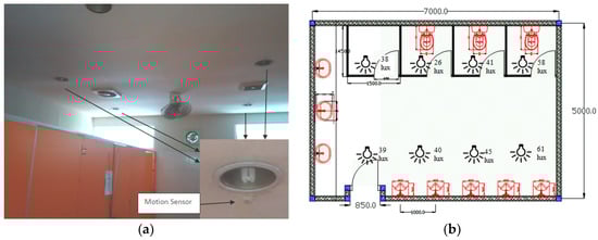 The electric equipment installed in the experiment room consisted of eight 23 W bulbs and six exhaust fans of 80 W each with daily operation of 14 hours from 7:00 a.m. to 21:00 p.m. Sensors are installed next to the lamp, as shown in Figure 3a. Measurement for the illuminance (lux) of the installed lighting uses lux meter placed under each lamp at a height of 1 m above the floor which shows the readings of the measurement in illuminance as shown in Figure 3b. Highest illuminance readings recorded are for under the lamps near the outside window, with lowest reading at the cubicle furthest away from both window and outside door. The accuracy of the lux meter is within ±6%. For each measurement, stable numerical values are obtained. At the time of measurement, the door of the restroom and room lighting is set to be as close as possible to the normal working condition.