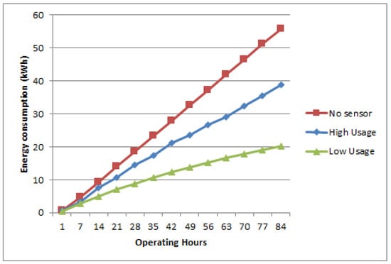 During measurement with sensors on Monday, 1 August 2016 at 8:00 a.m., with all lamps except ones near the toilet door being off and only the exhausts operating, the power meter reading shows 304.2 W and total consumption is 504.49 Wh. This reading is within reduction range after 1 h of operation (0.504 Wh vs 0.664 Wh). Measurement taken on Wednesday, 3 August 2016 at 14:30, after 35 h of operation, shows a 10.6 kWh of consumption versus 27.9 kWh for normal operation. The measurement data is shown in Table 1 and plotted in Figure 4. From Table 1, it can be seen that reduction to half of the normal consumption is achieved after 28 h. By the end of the week, the reduction reached 63.73%. As for high usage condition measurement starting from 5 September 2016, the saving for the first day (14-hour) operation yields only 18% reduction and by the end of the measurement period, the average saving is only slightly above 25%.