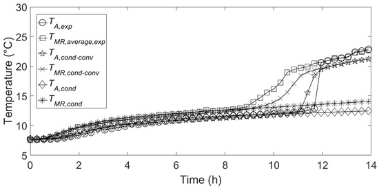 Figure 5 shows a comparison between the temporal variation of experimental temperatures inside the PCM, relative to the measuring points indicated in