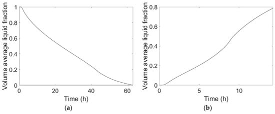 Figure 7a,b shows the temporal variation of the average liquid fraction of PCM volume during cooling energy charge and discharge, respectively, obtained by the conduction–convection-based model.