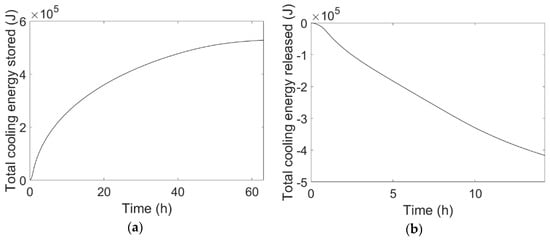 Figure 8a,b, which report the temporal variation of total cooling energy stored by the PCM during cooling energy charge and released during discharge, respectively.
