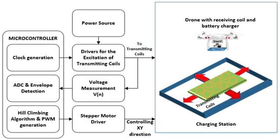 To solve the problem of misalignment of coils caused by the drone’s imperfect landing, a battery charging system based on wireless power transmission was developed in this work. The system is composed of a ground charging station and a receiving coil with the load. The charging station is equipped with multiple transmitting coils, whereas, on the receiver side, just one receiving coil is used. Multiple transmitting coils are placed on a movable bed which can move in four directions (positive X-direction, negative X-direction, positive Y-direction, and negative Y-direction). A control technique based on the hill climbing algorithm was implemented to control the alignment between the transmitting and receiving coil. The system was developed in a way allowing the drone to land freely on the charging station without the worry of alignment between the receiving and transmitting coil. The drone can land freely on charging station and the coils will adjust automatically in proper alignment to start the power transmission. Previously, the misalignment issues were solved using different methods, such as the design of a charging station with overlapped coils [35], using a target detection technique based on image processing [36], and using a positioning system based on physical sensors [37]. The proposed system is based on a novel method which uses the hill climbing algorithm on backscattered voltage signals of the transmitting coils. It improves the accuracy of the system and eliminates the flaws found in previous techniques such as the image-processing technique, where there are chances of missing the target. Also, it gives the freedom for the drone to land freely on a charging station and makes the system more adoptable by avoiding the use of physical sensors. The configuration of the proposed system is discussed in detail in Section 2.