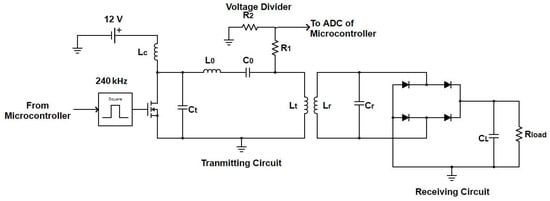 Figure 2 shows a simple wireless power transmission circuit. The circuit comprises a transmitter circuit, a receiving circuit, and the control part (voltage divider and analog-to-digital converter (ADC) of the microcontroller). The power amplifier drives the transmitting coil . When the receiving coil is brought near to the transmitting coil, the voltage at receiving coil is induced and it is processed by a bridge rectifier to convert AC to DC voltage. To achieve the optimum performance, values of and are calculated using Equations (1) to (4).