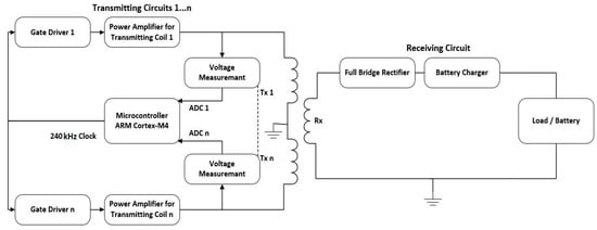 Block diagram of the circuit for wireless power transmission with multiple transmitting coils and a receiving coil.
