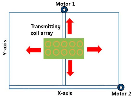 A four-way directional XY table was constructed to control the position of the transmitting coil array, as shown in Figure 4. The XY table is controlled by two stepper motors that are driven by two stepper motor drivers. Motor 1 is responsible for moving the transmitting coil array in the Y-direction, while motor 2 is responsible for moving it in the X-direction. When the quadcopter approaches the charging station, the transmitting coil, already excited having a constant voltage, experiences a change in voltage. This change in voltage refers to the presence of the receiving coil and load (battery). By measuring the voltage change from each transmitting coil, the charging station is moved in a direction where one of the transmitting coils is aligned to the receiving coil. The controller sends the required pulse width modulation (PWM) signals to the stepper motor driver to move the transmitting coil array to the proper position to initiate the wireless power transmission and battery charging.