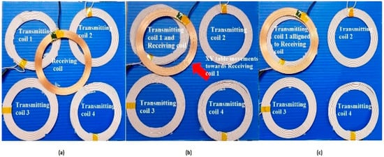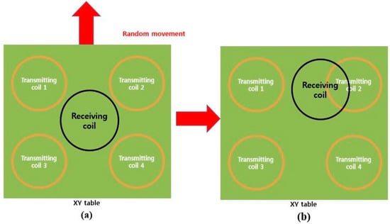 (a) Receiving coil’s initial position. (b) Receiving coil gets close to a transmitting coil after arbitrary movement.
