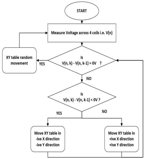 Figure 8 shows the overall flowchart of the proposed method. Figure 9 shows the flowchart of the hill climbing algorithm used in this system. Previously, authors tried to solve a different kinds of control problems using the hill climbing algorithm [42,43]. In this work, the hill climbing algorithm starts by sending the required PWM value to the stepper motor driver to move the XY table. At the start, when there is no change in the voltage, i.e., the drone is not on the charging station, there is no movement and the voltage of the transmitting coil is constant. When the drone lands on the charging station, there is a change in the voltage value, and the voltage decreases in the presence of a drone with a receiving coil. The hill climbing algorithm is activated and one transmitting coil with the maximum change in the voltage value is selected. The current terminal voltage of the selected coil is measured and compared with the previous measured voltage . The minimum value is stored as . After that, the controller sends the required PWM to move the XY table to the position of the minimum value. This kind of process keeps repeating until it reaches the minimum voltage. In Figure 9, is the number of transmitting coils, and is the number of the sample.
