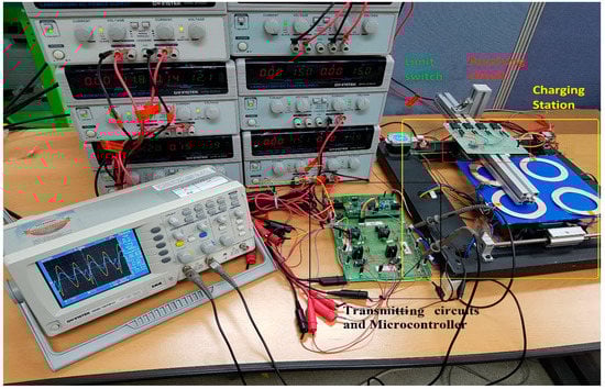 In Reference [33], the impedance of the transmitting coils was monitored, which requires some current and voltage sensors to provide the measured value at every instance of charging operation. It increases the complexity of the charging station and requires more electronic components. On the other hand, in our case, the voltages of the transmitting coils are enough to ensure proper alignment between coils. Regarding power transfer capabilities and efficiency, in Reference [37], the authors presented results based on the efficiency of wireless power transmission. The results showed that the efficiency of the system changed and decreased when there was misalignment between the coils. The efficiency met the minimum level requirement of 75% in all cases; however, upon misalignment, there was a reduction in efficiency from 88% (normal; no misalignment) to 83% (100-mm misalignment) and 78% (200-mm misalignment). In our system, the efficiency will always be the same (normal; no misalignment) because there is no misalignment and power transmission is done after ensuring this.
