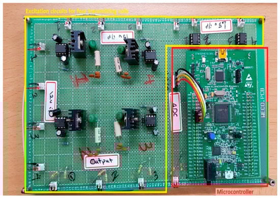 In this work, four excitation circuits for the four transmitting coils were developed. Each transmitting coil was connected to the excitation circuit. A gate voltage of 15 V and a supply voltage of 12 V were applied to the IRF510 metal-oxide-semiconductor field-effect transistor (MOSFET), and it was driven by a low-power 240 kHz clock signal, generated by the microcontroller. A voltage divider circuit was also built to decrease the output voltage into a voltage that was readable by the controller. Based on the proposed method and the equations presented in Reference [40], the optimum values of the electrical components for the excitation circuits were calculated. Table 1 shows the component values used in the excitation circuit, and Figure 11 shows a closer view of the excitation circuits and controller.
