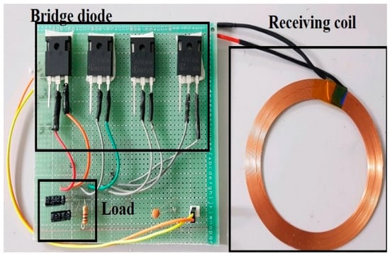 When the drone lands on the battery charging station and the XY table starts moving the transmitting coil array to the proper position using the hill climbing algorithm, the transmitting coil starts to couple inductively with the receiving coil. This inductive coupling between the coils induces voltage in the receiving coil. The receiving coil is connected to the receiving circuit as shown in Figure 3. The induced voltage at is processed by a full-wave bridge rectifier to convert AC to DC. In this system, rectification is achieved via four insulated-gate bipolar transistors (IGBTs), designed to work on high-frequency AC input signals. The output voltage is obtained across the load resistor . Table 2 shows the component values used in the receiving circuit, and Figure 12 shows a closer view of the receiving circuit and receiving coil.