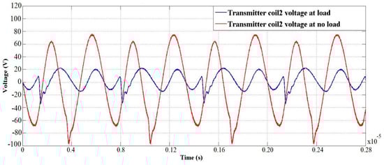 Voltage under no load (normal) and load (wireless power transmission) for transmitting coil 2.