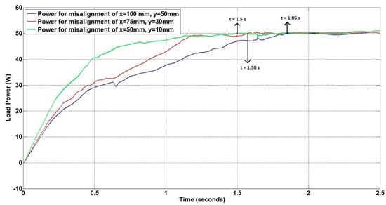 The system was designed for the transmission power of . Figure 16 shows the output power at the load resistance under different test scenarios. The misalignment distance between the coils was changed and the load power response was observed. The maximum load power was measured to be 52 W, which gives an efficiency of 85%. It can be observed in Figure 16 that, as the distance of misalignment between the transmitting and receiving coils increased, the time taken by the charging station (XY table) to properly align to the nearest possible coil also increased. In the case of a misalignment of x = 100 mm, y = 50 mm, it took almost 1.85 s to properly align the coils and transfer the power with designed efficiency. For misalignments of x = 75 mm, y = 30 mm and x = 50 mm, y = 10 mm, the time to align the coils was almost 1.58 s and 1.5 s, respectively. In a time ranging between 1.5 s and 1.9 s, the misalignment caused by the imperfect drone landing was eliminated and the power transmission was increased to the maximum power.