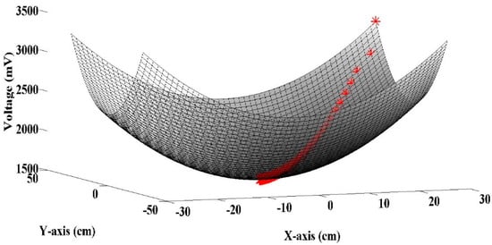 In order to validate the hill climbing algorithm, the data obtained from the practical test bench was used in MATLAB and simulations were carried out to assure the feasibility of the algorithm. Figure 17 shows the trajectory of the XY position for one transmitting coil in a three-dimensional space. It can be seen that, at the start, there is no voltage drop and the XY table is moved to a random position. After two random movements, the position with the minimum possible voltage value is selected and, from that position, the hill climbing algorithm is activated and it keeps finding the best possible positions to align the transmitting and receiving coils until the minimum level is achieved. Once the minimum level is achieved, the transmitting and receiving coils are aligned properly and wireless power transmission starts with full efficiency.