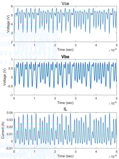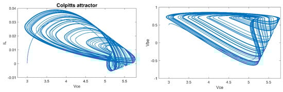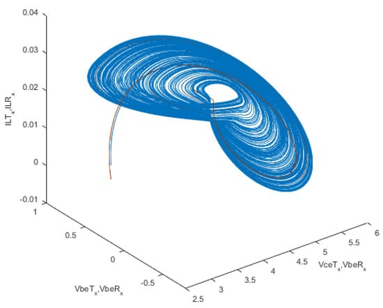Figure 2 shows the voltage and current waveforms for all the states given in (1) when operating in chaotic mode, that is, when using the parameters given in Table 1. VBE(t) is highlighted since it represents the transmitted carrier signal, which is also used at the Rx to ensure coupling between both chaotic trajectories. Further detail is given in the upcoming paragraphs. As follows we show Colpitts chaotic attractor projection, obtained by plotting the states against each other, shown in Figure 3.
