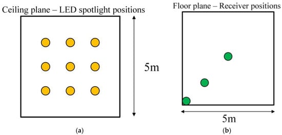 Typical room projections with Tx LED spotlights ceiling (a) and Rx positions (b).