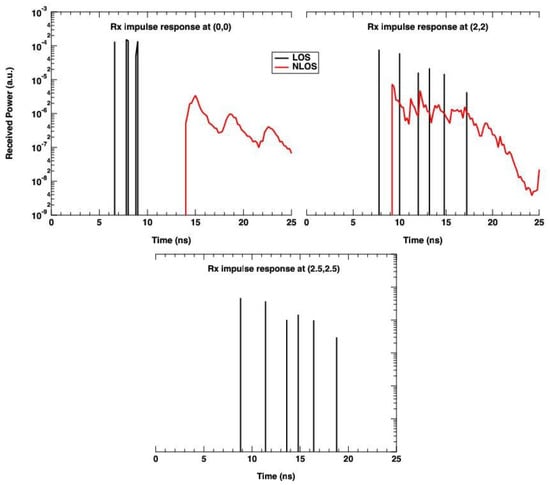 where hLOS(t) and hNLOS(t) are the LOS and non-LOS impulse responses, respectively as defined in references [31,34]. Figure 9 shows the predicted impulse responses for three different Rx’s positions of (0, 0), (2, 2), and (2.5, 2.5).