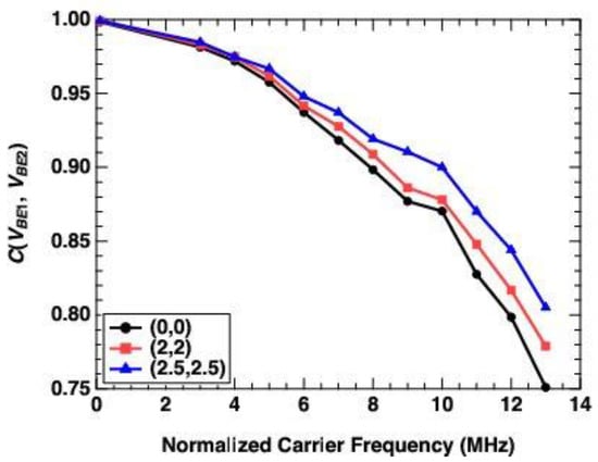 Table 2 presents the correlation values for the chaotic carrier VBE_TX(t) and its respective synchronized state VBE_RX(t) for every corresponding position and frequency. This has been calculated using the standard cross-correlation equation between the transmitted signal and the corresponding generated signal for every position and the multipath model outlined in Section 2 given in [31,34].