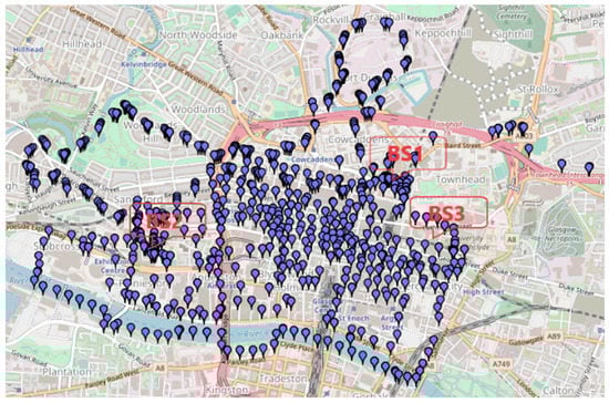 About 5000 data samples were collected over a relatively large area (4.25 km × 2.7 km) in the commercial area of Glasgow, Scotland. Data was collected from three base stations at different locations, with 1931, 1820 and 1256 samples being collected from BS1, BS2 and BS3, respectively. Figure 1 shows the area of the investigation, where some of the measurement locations are pinpointed with markers, and gateways are labeled as BS1, BS2 and BS3. Base stations are equipped with the same antennae, mounted relatively at the same height from the ground. Data was analyzed to provide an insight of the performance of the proposed model.