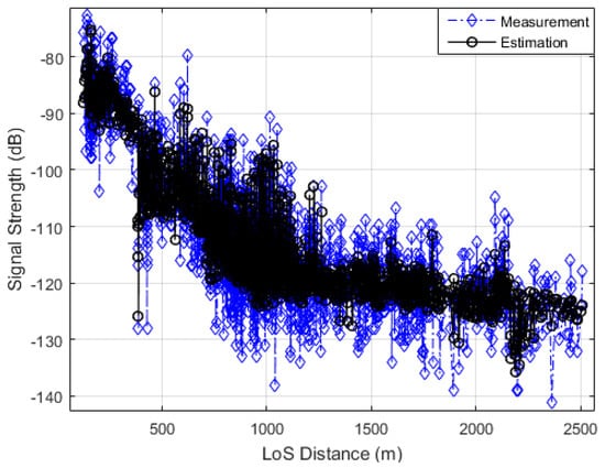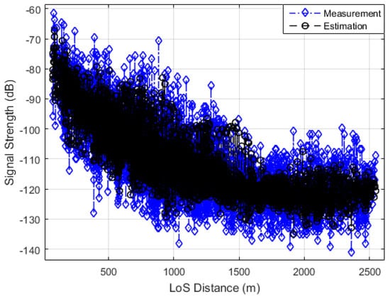 To check the goodness of fit and benchmarking with other models, the most commonly used measures in the literature were reported, RMSE (root mean square error in dB), (error standard deviation dB) and (mean error dB). Unfortunately, the first two measures depend on the range or scale of data and ignores the error sign. Therefore, to address these issues, the Nash-Sutcliffe efficiency (NSE) coefficient is used as a measure of the goodness of the fit. Having a universal measure of performance benchmarking is especially important, as various wireless technologies have different sensitivities. This difference impacts the dynamic range of measured data and, therefore, its RMSE scale; however, the NSE is less prone to the dynamic range. NSE ranges from −∞ to 1, where 1 would indicate a perfect match between the model predictions and measurements [].