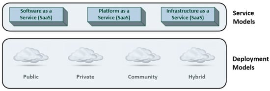 According to the National Institute of Standards and Technology (NIST), Cloud computing has four deployment models: Public, private, hybrid and community []. Furthermore, typically there are three delivery models: Infrastructure as a Service (IaaS), Platform as a Service (PaaS) and Software as a Service (SaaS) (see Figure 1).