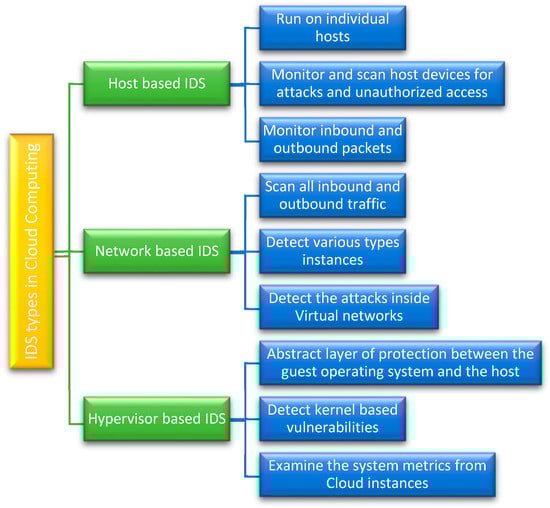 As we know that the backbone of Cloud computing is a high-speed network, therefore this calls for the use of an automated or faster IDS/IPS. IDSs have a variety of flavors and approaches used to detect suspicious traffic (see Figure 2). A network-based intrusion detection/prevention system (NIDS/NIPS) attempts to secure all devices on a network by analyzing network traffic for signs of malicious behaviors, while a host-based intrusion detection/prevention system (HIDS/HIPS) attempts to secure one particular host []. HIDS/HIPS is particularly used to secure valuable or private information on a specific server. As well as HIDS/HIPS and NIDS/NIPS, hypervisor-based IDS provide another type IDS used to ensure the security of data and information in the Cloud. This type of IDS/IPS runs inside the hypervisor, making it possible to monitor and analyze communication between VMs, hypervisors, and the virtual network.