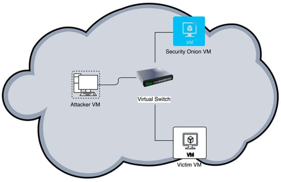 The experimental environment is a highly flexible, centralized virtual lab infrastructure, which consists of an ESXi server hosting three VMs: Security Onion (SO) [], Kali Linux [] and Metasploitable [] (see Figure 3). In this setup, SO runs the IDS instance, Kali hosts the attacker and Metasploitable is the victim/target machine. ESXi 6.0 is used which is a robust, high-performance hypervisor that virtualizes hardware resources and makes them shareable by several VMs inside VMware Workstation 12 on Intel (R) Core (TM) i7, 16GB RAM and 734GB hard disk space.