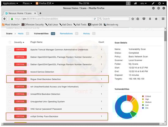 The result of the Nessus scan (see Figure 6) is strictly based on services, which are open and active, it also includes an OS and applications discovered in earlier phases. The total number of vulnerabilities found was 112, but we only focused on two vulnerabilities (rouge shell backdoor and VSFTPD smiley face backdoor) which both have a critical level of severity. Compared to other vulnerabilities that are at a critical severity level, the chance of exploiting Samba and VSFTPD is at a reasonable level due to the fact that some preconditions need to be met before the exploit can take place [].