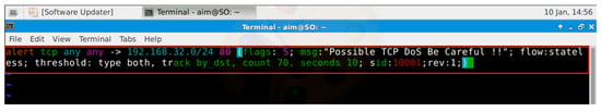 Before we started launching the DDoS attacks, we added several rules into our Snort IDS engine to make sure it able to detect malicious traffic and generate appropriate alerts. Figure 10 shows an example of one of the rules added to the local.rules file.