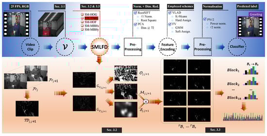 The framework of the proposed approach as shown in the upper row, and the outline of the main steps of the saliency map-enhanced LFD extraction approach (SMLFD) as illustrated in the lower row using the histogram of motion gradients (HMG) approach with 8 bins and 18 blocks.