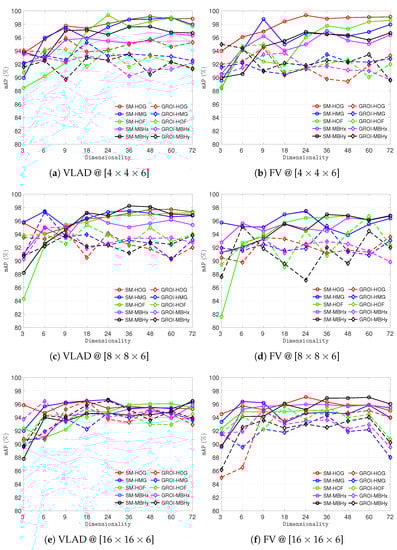 In this experiment, the effect of varying the number of visual words used in the VLAD and FV feature encoding scheme was investigated. Specifically, half of the visual words were used to compare with the setting in the experiment reported in Section 4.2. The impact of feature dimensions was also investigated when using PCA in the preprocessing phase. The results are shown in Figure 2. The experiment used 3, 6, 9, 18, 24, 36, 48, 60, and 72 feature dimensions. SMLFD outperformed GROILFD when using a small number of visual words for feature encoding. The best performances that were achieved by SMLFD are summarized in Table 3. As shown in Figure 3, SM-HOG exceeded other approaches in most cases when using block sizes of and . However, SM-HMG outperformed others in most cases for a block size of .