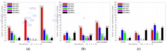 Statistics of the best performance obtained for each employed block size. (·) denotes the number of best performances that were equivalently achieved by other feature descriptors in the SMLFD family. (a) ; (b) ; (c) .