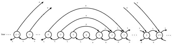 A rate diagram for the continuous-service M/M/1 queueing system.