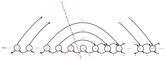 A rate diagram for the continuous-service M/M/1 queueing system with a cut.