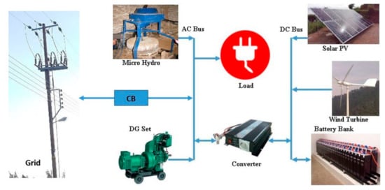 Figure 1 presents an example of a DGS containing micro-hydro power plant, solar PV, wind turbine, diesel generator as the energy-producing units, the battery bank as a storage device, load, and finally grid as an optional choice. The voltage level of AC and DC bus bars may be the same or different, but in general the DC level is low and controlled through the converter. A circuit breaker (CB) is placed between the grid and the AC bus system. Here, if the CB is open, the energy system, excluding the grid system, can be considered as IES, and, if the status of CB is closed, the system will be grid-connected. In Figure 1, the system can be operated in either an isolated or grid-connected mode. The flow of the current in the CB section may be unidirectional or bidirectional, depending on the nature of the connection and the local policy of energy trading.