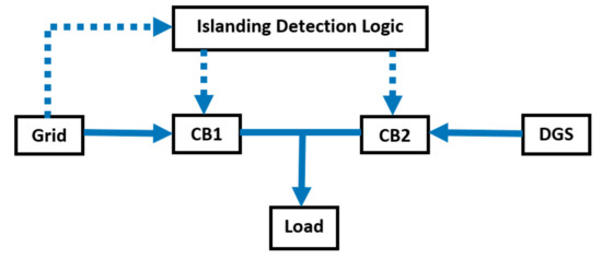 In the present power system with distributed generators (DGs), there are some issues that are not resolved yet. One of these issues involves a fast and very accurate detection of islanding [1,2]. The number of DGs introduced into electricity distribution systems is increasing day by day, and it is the most challenging concept in modern power system scenarios, since DG islanding can cause degraded proficiency, excellence, reliability and quality of supply [3,4]. The concept of Distributed Energy Resources (DER) is moving from being a local issue towards a system issue [5]. With the connection of DGs, the power system becomes more complicated [6]. With the introduction of the reference power transition link, the grid connection process is further ensured to be smooth [7,8]. The main difficulties that researchers encounter are not the lack of data, but the efficiency of using complex electrical quantities [9]. The issue of unintentional islanding in DGs grid interconnection still remains a huge challenge in grid-connected systems, since the system may not succeed at activating the protective devices during the islanded condition [10,11]. This results in the issues related to the power quality, protection, reverse power flow and system stability [12]. Hence, the condition of islanding must be detected and cleared as fast as possible as per the recommendation of grid codes [13]. The maximum time to respond to the islanding detection is recommended to be 2 s by IEEE [14]. The islanding protection devices being used in the future have to reflect this. Safety measures must be taken for correct operation of these new DGs so as to prevent uncontrolled and undesired power injection into the grid and possible damages to equipment and personnel [15]. Thus, a thorough study is needed in solving this issue. Hence, anti-islanding with fast response time is essential for a DG connected grid system [10,16]. To overcome the challenges from islanding DGs, researchers proposed a numerous model that deals with the consequences of intentional islanding, and clears it as fast as possible [11,12,17,18,19,20,21,22,23,24,25,26,27,28,29]. Different organizations such as the IEEE, IEA and IEC also set the standards and were updated regularly to emphasize the importance of islanding detection in a DG connected grid, so that a DG connected system will operate smoothly [14,30,31,32].