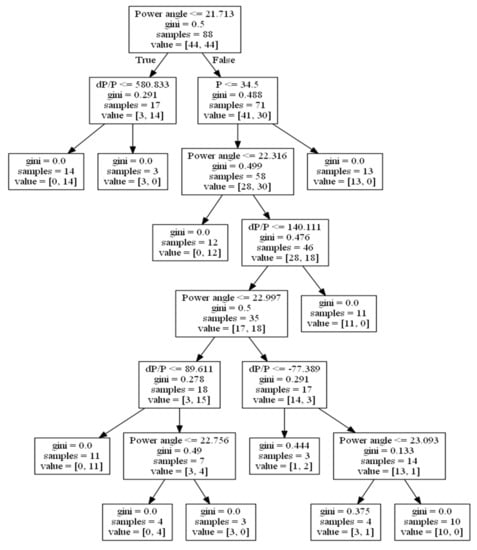 The data from the 13-bus system is extracted into the tree model by using the Classification and Regression Tree Algorithm (CART). The CART algorithm uses the predictive modeling for designing the decision tree. CART was first developed by Breiman et al. in the 1980s [75], and was first introduced in the Power System by Wehenkel [76,77]. The CART model of the DGS is obtained by recursively partitioning the data space and fitting a simple prediction model within each partition, due to which partitioning can be represented graphically as a decision tree [78,79]. CART uses the empirical impurity reduction known as Gini Index for splitting the node and selects the split that maximizes the decrease in impurity and generates the sequence of sub-trees by growing a large tree and pruning back until only one root node is left [80]. The Gini index is given by: