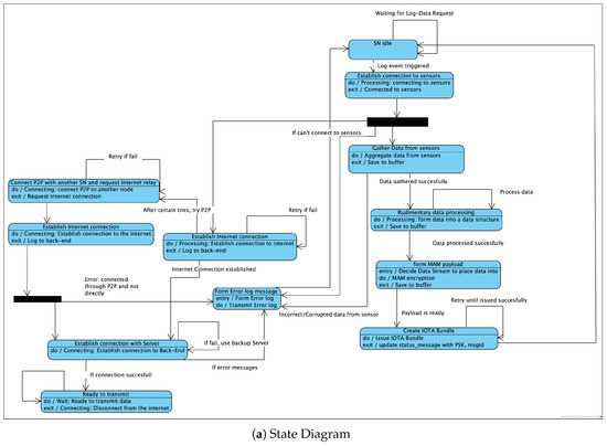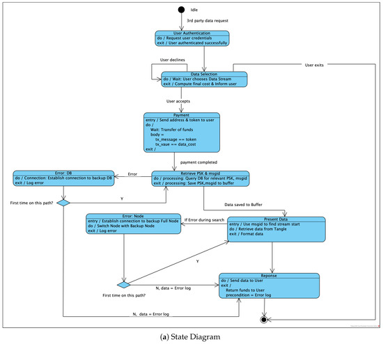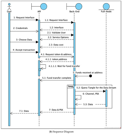 Figure 9 illustrates the activities diagram of a typical IoT application that was used as a template for the implementation of our prototype [38]. The diagram was further simplified in order to keep the complexity of the prototype low. The semantic notation submodule was removed as it was deemed unnecessary. The MAM submodule is an addition to the generalized IoT architecture, providing a service which is responsible for receiving the data and based on the metadata, creates the appropriate MAM messages. This submodule is also responsible for connecting to the IOTA Full Node. The final architecture that was adopted is shown in Figure 10 and Figure 11.