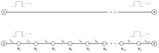 If we have an ideal line, the signal will travel at light speed from node to node and we can easily know the duration of each time-step according to the length of each segment. The signal will arrive at receiver R with the same shape as it was generated by S. This approach of time-steps and line-steps will afford us towards computational models to deal with a broad range of issues, as will be detailed below.