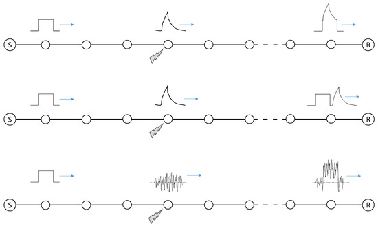 An interference originated by an external source strikes the line at a random node, propagating through the line. It may happen at the time when the squared signal is passing, distorting the signal that reaches the receiver R (top) or maybe dislocated in time, changing the original signal sequence at R (middle). If a noise hits the node (bottom), the squared signal could be completely distorted.