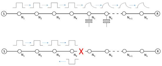If external interferences can affect the functional features level, internal structure features can affect it as well. Two examples in Figure 5 illustrate how internal structure features can damage or destroy a message—that is, how the functional features will be affected by the structure and at what amount. Line structural variations could modify the signal sent by S in such a way that R could misunderstand it, as shown by the first example (Figure 5 top). The electrical line may present a different and increasing capacitance from node N5 and beyond, significantly distorting the signal along its length, and the traveller square voltage signal is reshaped (by obvious illustrational purposes the figure exaggerates the representation). The second case shows a failure that intermittently interrupts the line-segment between N5 and N6, and no signal achieves the receiver R when the N5-N6 link is off (Figure 5 bottom). Figure 5 shows that physical structure features may have varying degrees of robustness, i.e., from relatively distorting the system performance (the functional processes still work) to completely outages (no processes occurring at all).