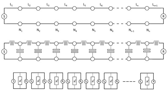 Going further with the simple telecommunication line above described, let us see it as a metallic transmission line as illustrated in Figure 6, where a transmission line connects source S to receiver R and is split into n nodes N (Figure 6, top). The transmission line parameters are its inductance and capacitance, and losses are determined by its resistance and conductance. Figure 6 (middle) shows a representation of the line segments and their distributed inductances and capacitances (for design clarity the resistance and conductance are not shown). These parameters are specific structural characteristics.