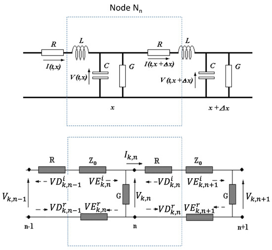 Our approach considers the example showed in Figure 7, which is derived from [8,12]. The top picture shows segments x and x + Δx of a transmission line with parameters L, C, G and R (inductance, capacitance, conductance, and resistance respectively). The node Nn comprises these parameters around the point x, which is modelled as an impedance Z0 with losses represented by R and G (respectively resistance and conductance for the segment with length Δx (Figure 7 bottom). This representation is called the transmission line method model, where the node Nn is a transmission line itself, with the incident and reflected voltages for each time-step. A complete description of the one-dimensional method and its equations were given in [8,12]. Below, we summarize its most important concepts and equations, which will be useful to model the system’s dynamical behaviour and the nonlinear filter in the sections following.