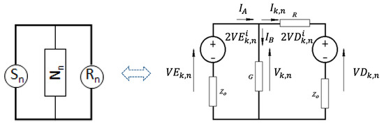 From Figure 7 (bottom), we know that the relationship between incident (Vi) and reflected (Vr) voltages at iteration k for the node n can be obtained by adding their contributions, which determines its total voltage on the left (VEk,n) and right (VDk,n), as seen in the following equations: