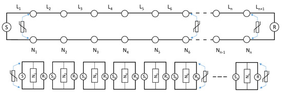 Metallic transmission line connecting source S to receiver R, considering n nodes N (top). The transmission line segments have distributed inductances and capacitances, their specific structural characteristics (middle). Each line segment can be seen as a transmission line itself, considering also distributed sources Sn and receivers Rn (bottom). This line segment is called a “node” of the network.